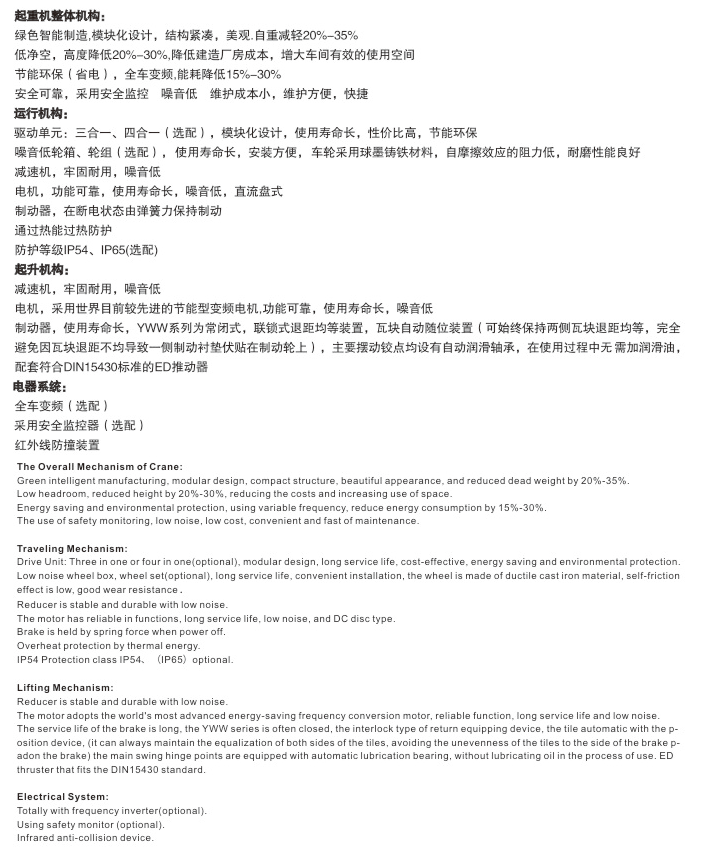低噪音、免維護(降低檢修時間及維護成本低)(因結(jié)構(gòu)簡單,故配套件品種少,后期方便采購,同時也降低了庫存)。我公司的歐標起重機通過變頻器調(diào)速,能有效減少用電量20%-30%,降低了使用成本,提高了使用效率。